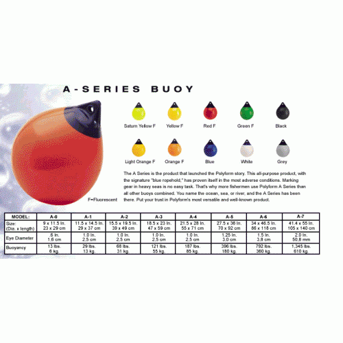 Polyform’s A Series buoys are the only one-piece reinforced rope hold buoys on the market today. They are widely used in commercial fishing, offshore oil research and general commercial marine as well as recreational marine and sport fishing. Available in seven sizes, from 9 inches diameter to 34 inches diameter, with buoyancy from 13 to 792 lbs. Color choices range from high visibility fluorescent colors for commercial fishing to Classic White and Polyform Blue for the recreational boater. Throughout the world more people rely on the A series more than all other buoys combined. Put your trust in Polyform’s most versatile and popular product.
